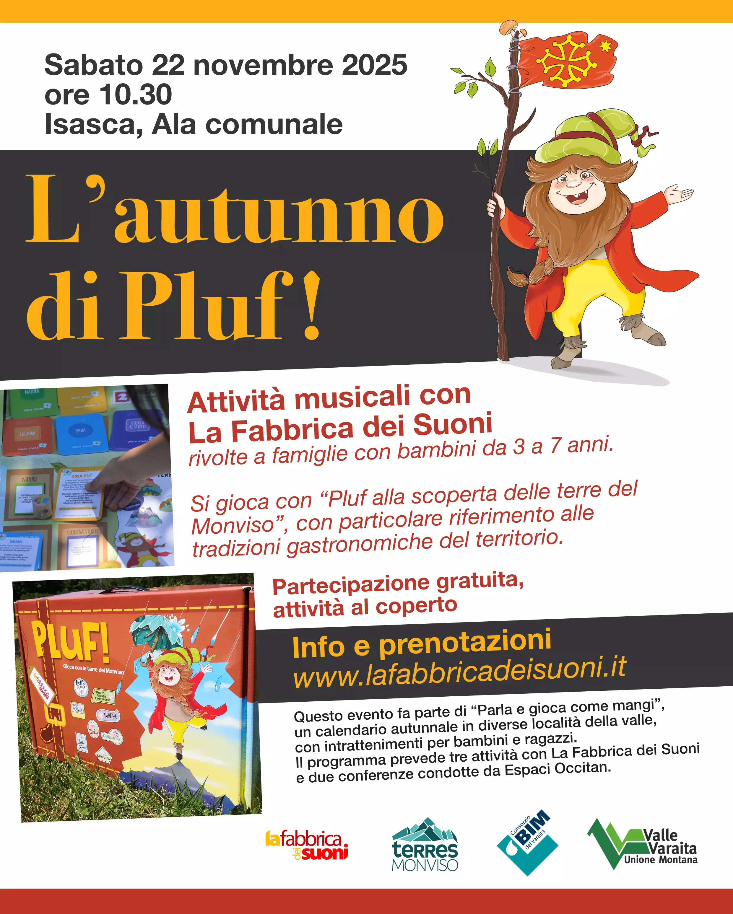 In un ambiente coperto e riscaldato messo a disposizione dal Comune di Isasca che collabora all’organizzazione, si giocherà con Pluf alla scoperta delle terre del Monviso, con particolare riferimento alle tradizioni gastronomiche del territorio, utilizzando il gioco in scatola realizzato nell’ambito di precedenti progettualità Interreg ALCOTRA. La partecipazione è gratuita, con prenotazione obbligatoria dal sito www.lafabbricadeisuoni.it.