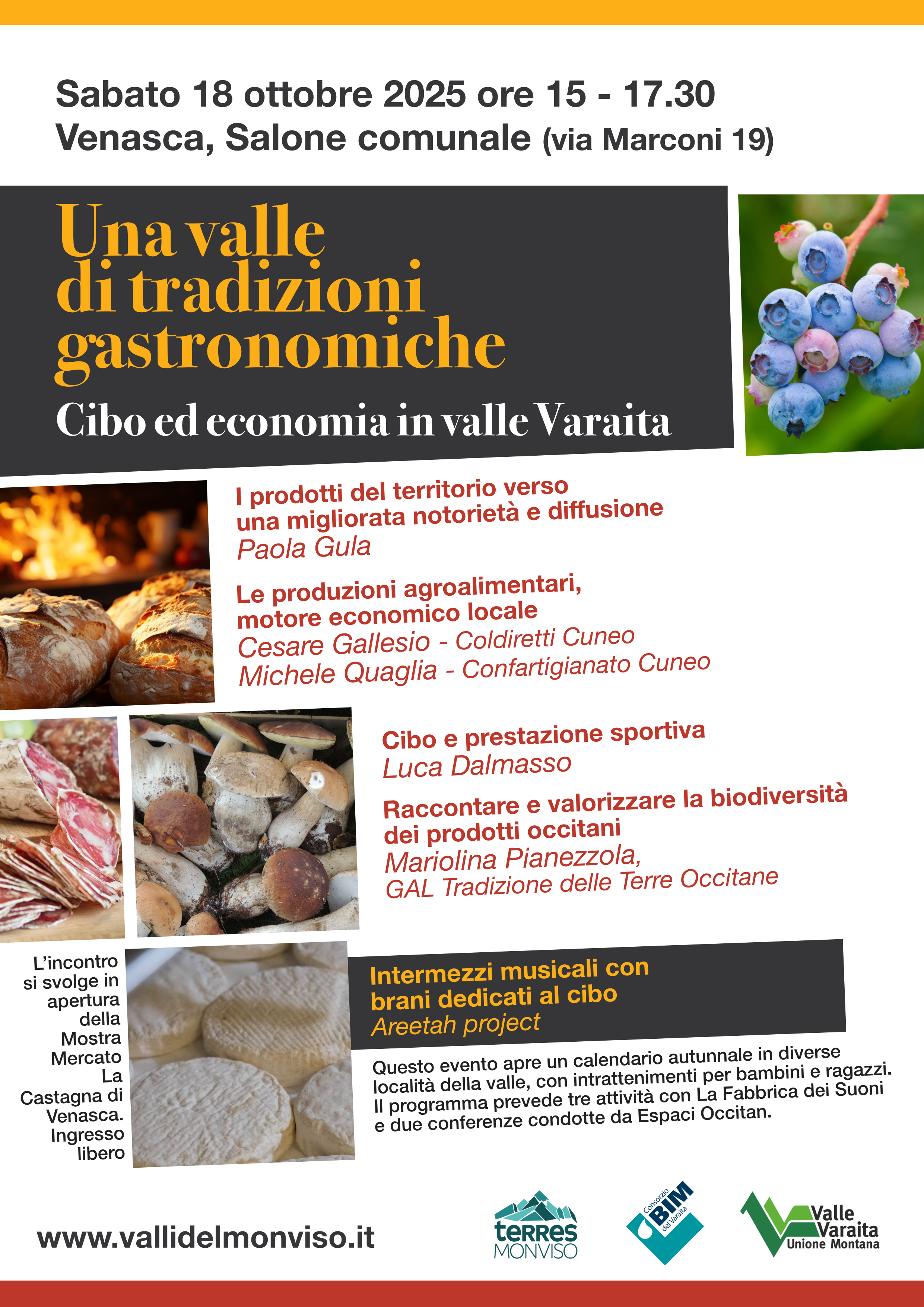 In occasione dell’apertura della Mostra Mercato La Castagna di Venasca, l’Unione Montana Valle Varaita organizza un convegno in cui discutere dell’importanza dei prodotti tipici agroalimentari del territorio sotto più punti di vista: quello economico, con una valutazione dell’impatto del comparto sull’economia locale fatta da parte di Cesare Gallesio di Coldiretti Cuneo e da Michele Quaglia di Confartigianato Cuneo; quello nutrizionale, con particolare attenzione alle esigenze degli sportivi, con Luca Dalmasso; quello del rapporto tra cibo e biodiversità con la direttrice del GAL Tradizione delle Terre Occitane Mariolina Pianezzola, che presenta le progettualità di divulgazione e sensibilizzazione sul tema attualmente in corso.