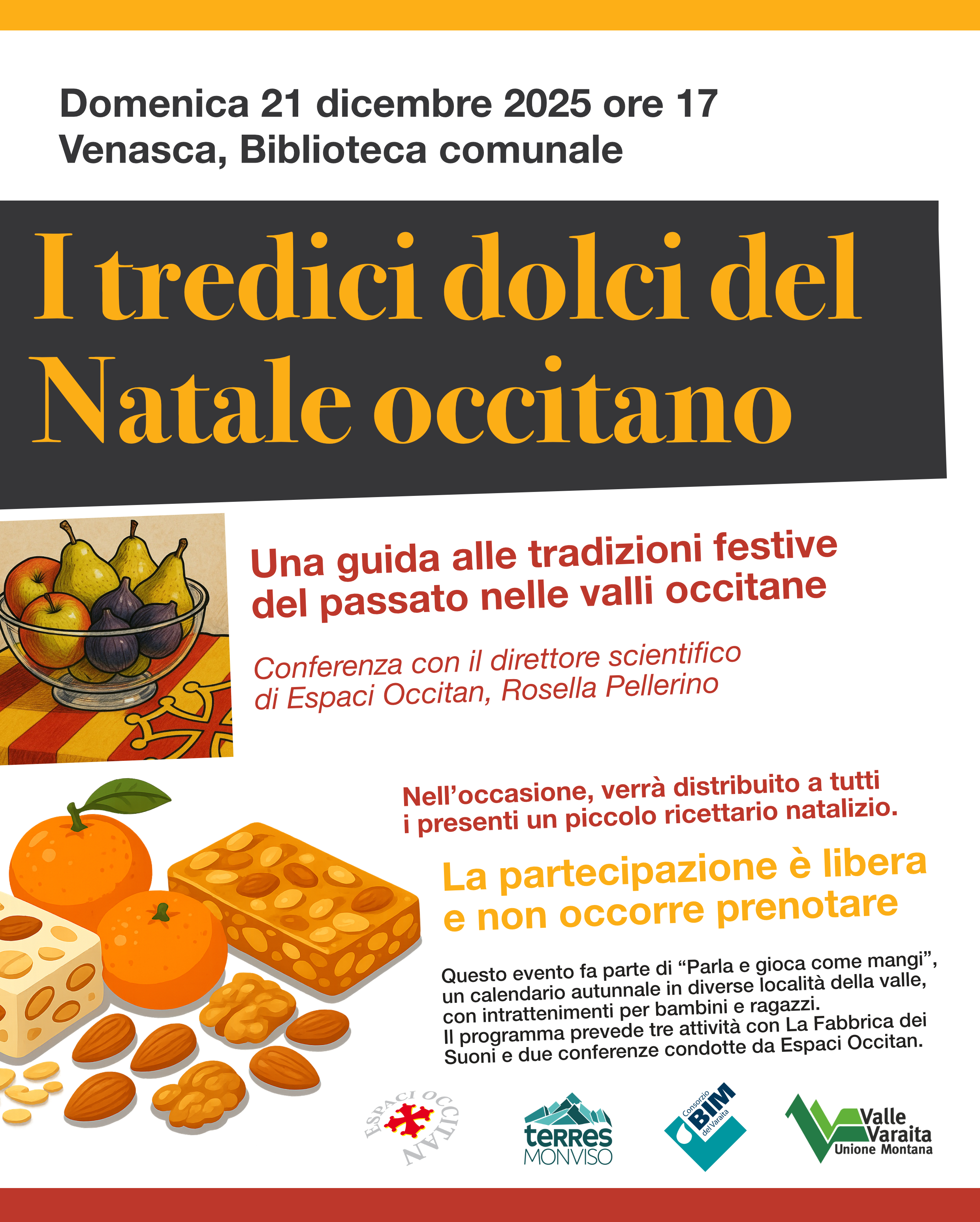 Domenica 21 dicembre alle ore 17 a Venasca, nella biblioteca comunale di via Casavecchia 14, si svolge l’ultimo appuntamento di “Parla e gioca come mangi”. In programma “I tredici dolci del Natale occitano”, una conferenza del direttore scientifico di Espaci Occitan Rosella Pellerino dedicata alle tradizioni festive e culinarie del passato nelle valli occitane. Nell’occasione verrà distribuito a tutti i presenti un piccolo ricettario natalizio a tema. La partecipazione è libera e non è richiesta prenotazione.